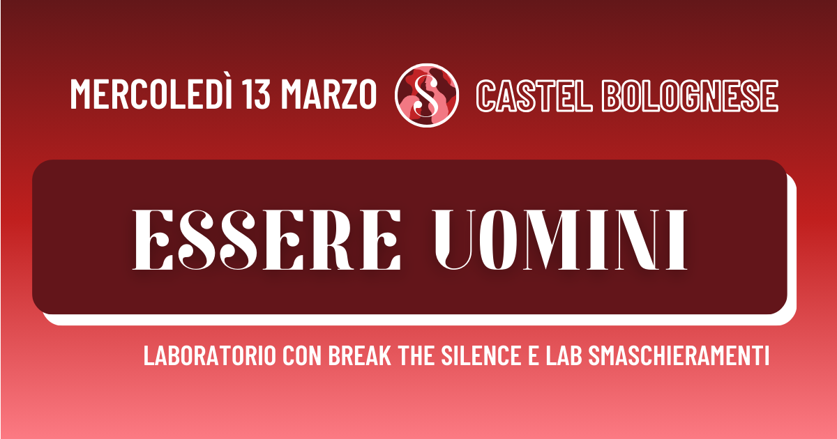 Dibattito collettivo in cui tutti/e i/le partecipanti possono liberamente intervenire e portare esperienze e condividere il proprio pensiero. I momenti di confronto saranno alternati con momenti di riflessione guidata dall’ Associazione Break The Silence Italia. Lo scopo della serata è stimolare un dibattito costruttivo e informativo per comprendere il ruolo dell’uomo nelle relazioni sentimentali e sociali. La serata sarà organizzata in collaborazione con il Laboratorio Smaschieramenti.