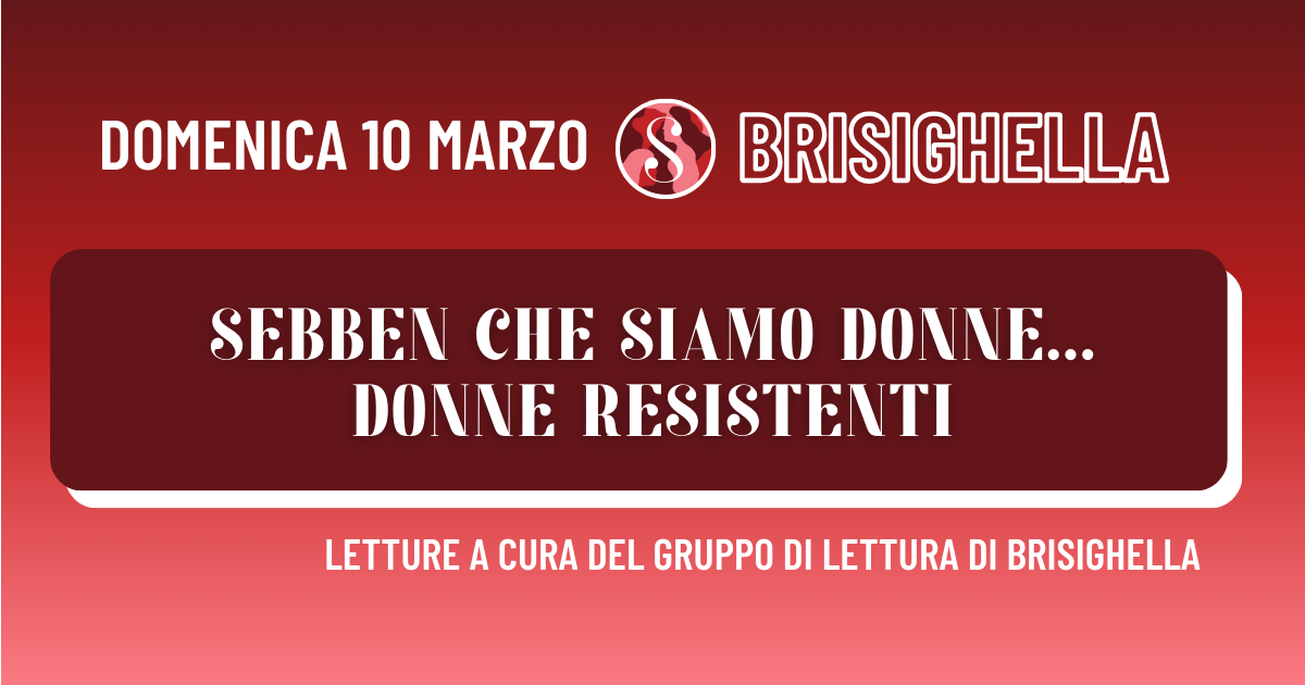 L’ANPI sezione Giuseppe Bartoli e l’ARCI Ambra di Brisighella organizzano l’evento denominato “Sebben che siamo donne…- Donne Resistenti” dedicato alla scrittrice Michela Murgia. In programma letture a cura del Gruppo di Lettura di Brisighella, filmati intervallati da musica dal vivo e, a seguire, apericena.