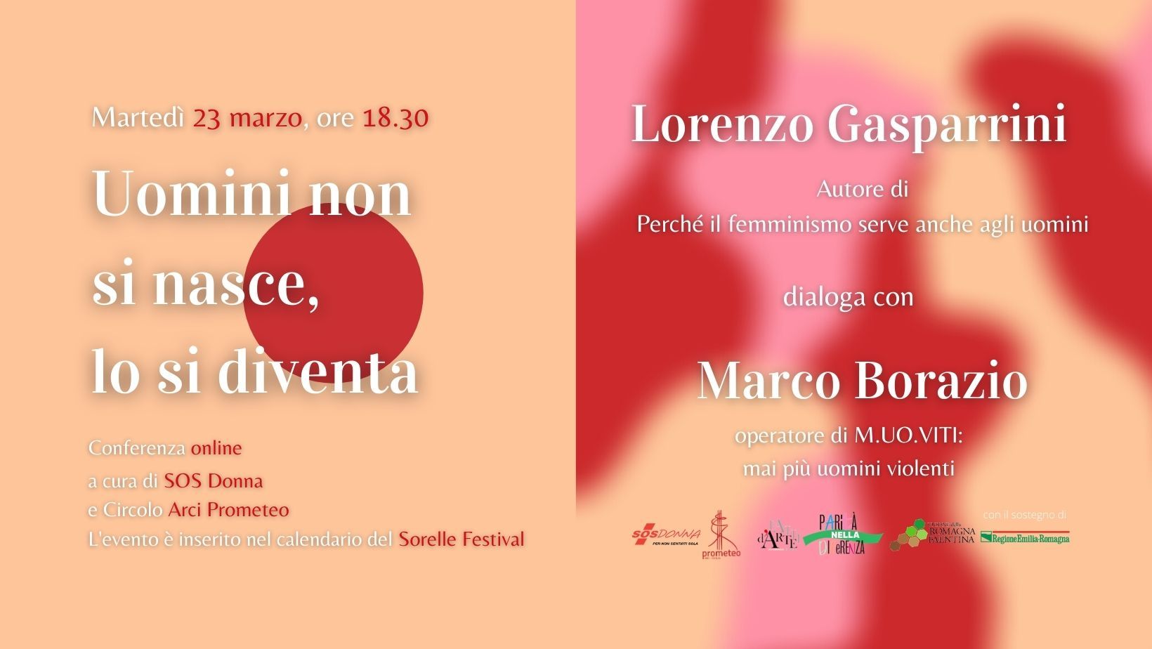 L’iniziativa è organizzata dall’Associazione SOS Donna, centro antiviolenza di Faenza, in collaborazione con Associazione Fatti d’Arte e Circolo Arci Prometeo. Evento inserito all’interno del programma di “Sorelle Festival” e realizzato nell’ambito del progetto regionale “Parità nella differenza”.